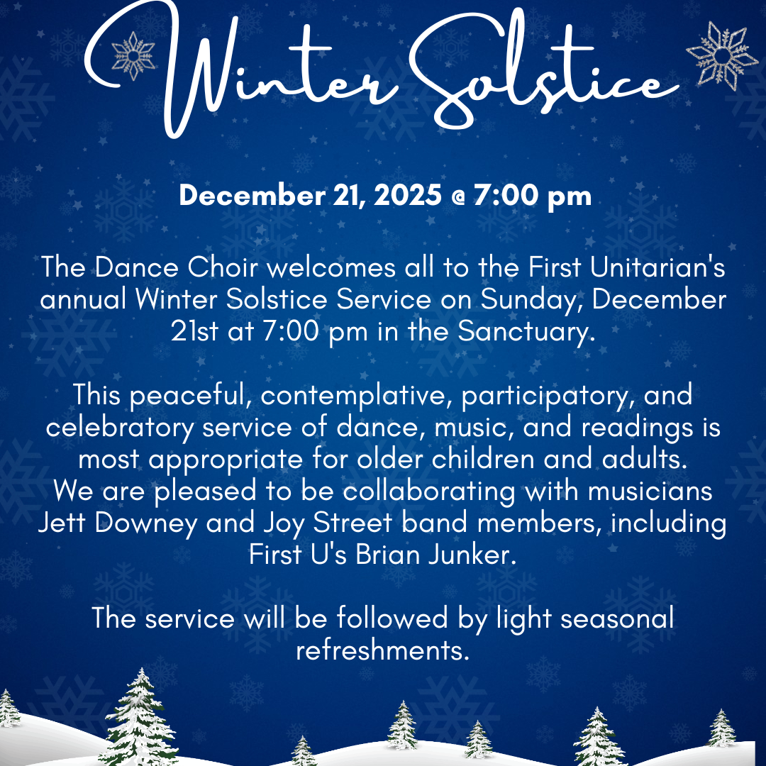 The Dance Choir welcomes all to the First Unitarian’s annual Winter Solstice Service on Sunday, December 21st, at 7:00 pm in the Sanctuary. This peaceful, contemplative, participatory, and celebratory service of dance, music, and readings is most appropriate for older children and adults.