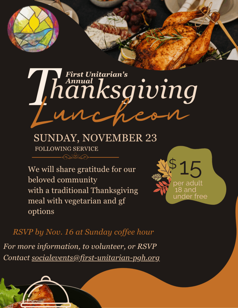 In 2025 we launched an exciting campaign to make our church more welcoming, accessible, and sustainable. Planned improvements include energy-efficient heating and cooling, upgraded lighting and sound, a modern video system, outdoor enhancements, and a long-term endowment. We invite every member to get involved. Learn more.First Unitarian’s Annual Thanksgiving Luncheon